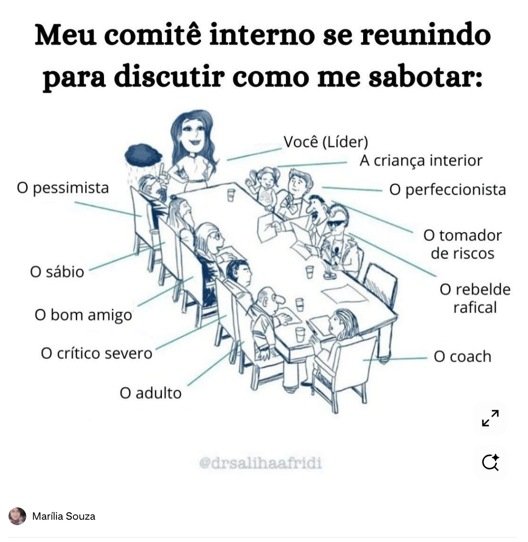 É como se cada uma dessas vozes tivesse uma cadeira, opiniões, medos e intenções e você, como líder de si mesma, precisa aprender a escutar, discernir e integrar cada uma delas.